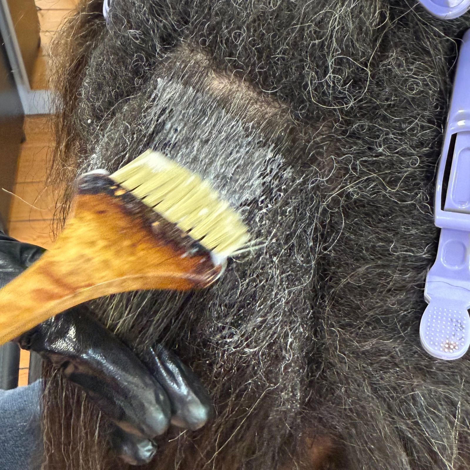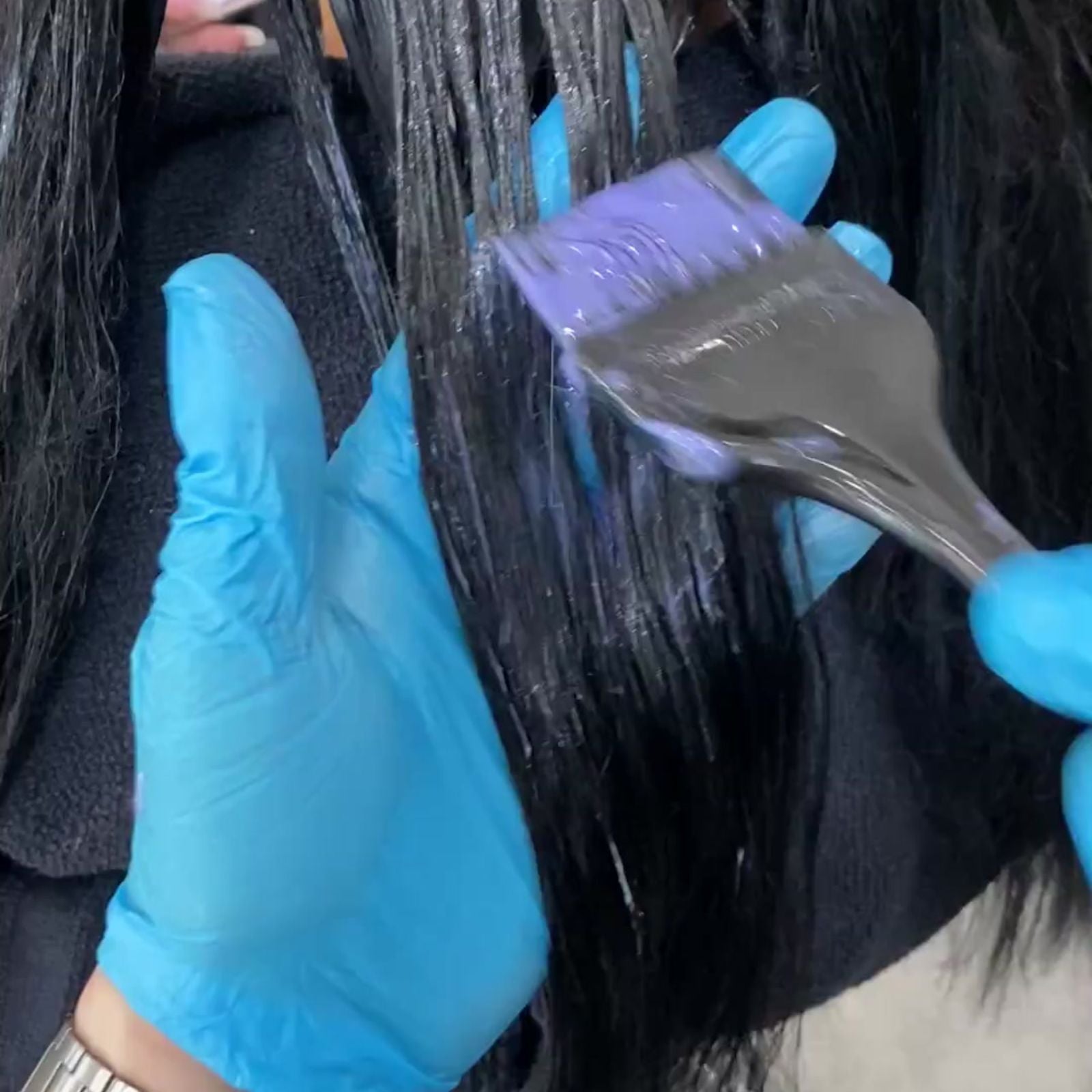 - Wash 2× with clarifying shampoo, rinse and dry the hair 100%.