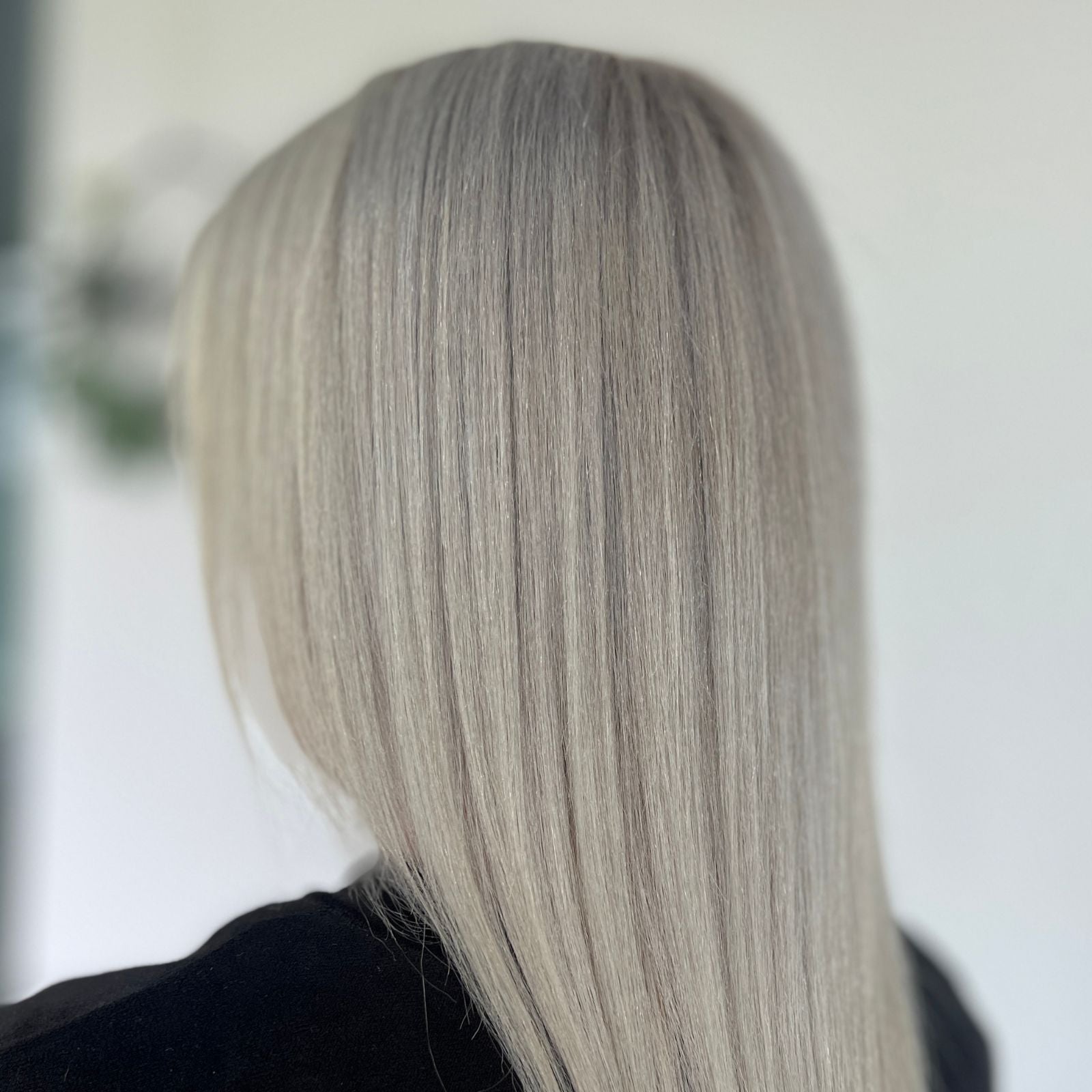 - Apply a violet/blue demi toner to neutralize and bring the hair back to a cool gray.